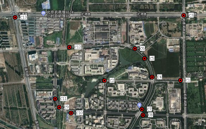 根據對環保園無人駕駛示范區的現場勘察,綜合考慮道路情況和遮擋情況后,5150MHz-5850MHz頻段選定圖3中的13個點位,進行EUHT-5G基站部署;600MHz-800MHz頻段選定圖4中的5個點位,進行EUHT-5G基站部署。