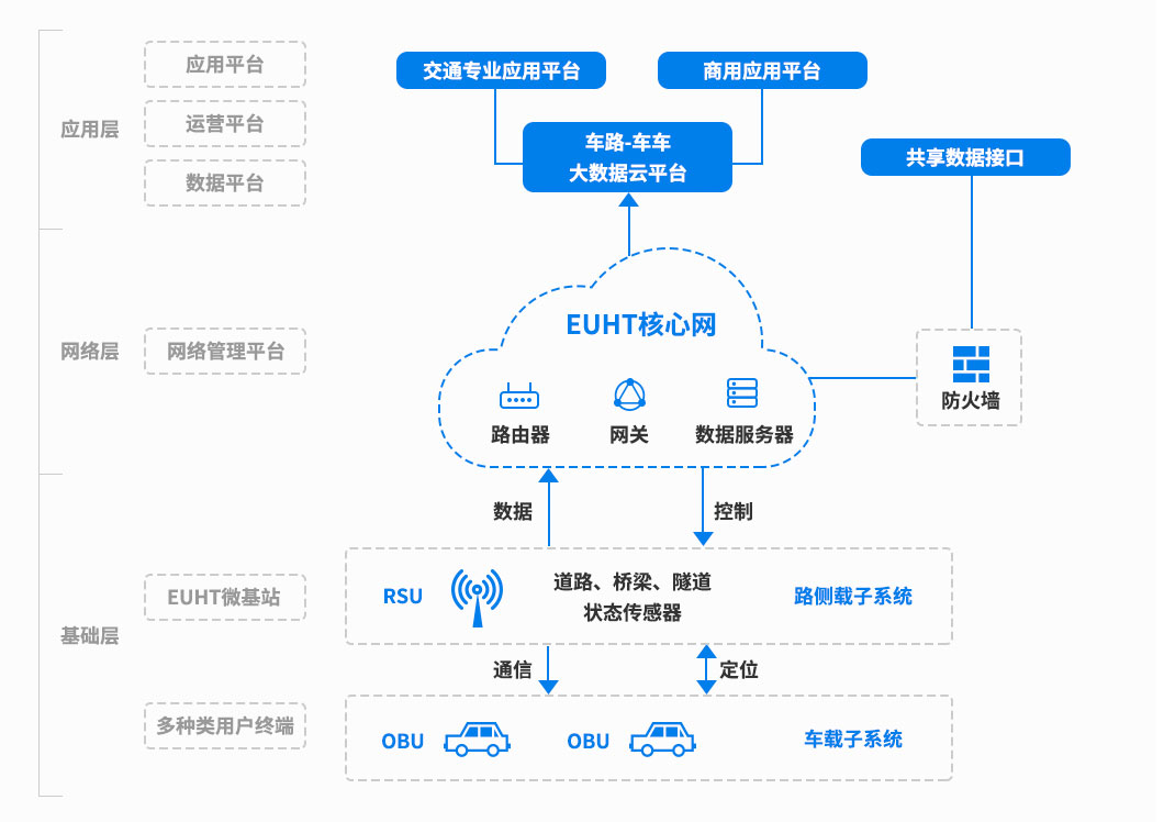 EUHT智能交通方案提供高可靠、低時延、低成本同時支持高吞吐率的車路、車車無線通信系統,通信網絡同時集成車輛亞米級實時動態定位服務。支持車路協同、安全應急、信息服務等一系列智慧交通應用。