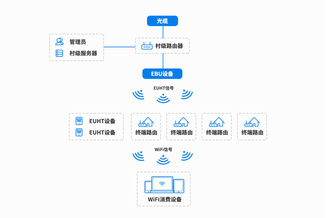 電信運營商的光纖到村后接入村級路由器,根據(jù)村子的地形地貌情況在抱桿上安裝在2-3臺中心接入設(shè)備,一方面通過網(wǎng)線接入村級路由器,另一方面采用定向天線將EUHT網(wǎng)絡(luò)覆蓋至整個村落。